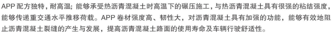 路桥专用塑性体(APP)沥青防水卷材是以APP路桥专用改性沥青为防水涂改物,经辊压密实,表面以聚乙烯膜、细砂、页岩片等矿物粒料为隔离、保护覆盖材料制成的耐高温柔性防水材料。