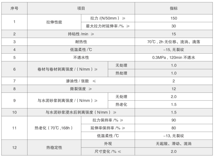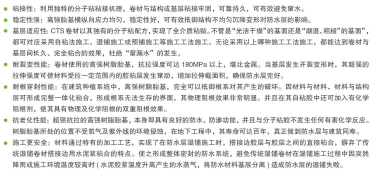 GTS高分子自粘防水卷材是以高强树脂为胎基,与特殊的自粘胶料相复合而成,可与砂浆或混凝土基层实现分子级的完美贴合。该产品具有优异的粘接性、稳定性、耐裂变性、抗老化性能、极强的抗拉强度和抗基层缝变形能力,克服了传统防水卷材的诸多不足。